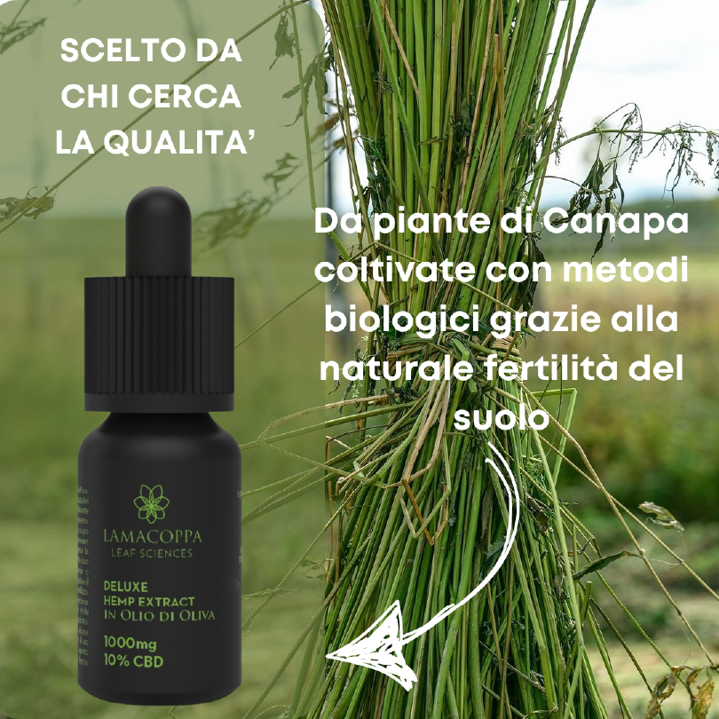 L’olio CBD 10% proveniente dalla pianta di canapa è un composto naturale di natura vegetale contenente il vettore, l’olio evo e il cannabidiolo o CBD. Il CBD è uno dei numerosi cannabinoidi presenti nella pianta di Canapa Sativa L. Il CBD che utilizziamo per il nostro Olio CBD è un estratto 100% naturale, realizzato a partire da piante di canapa selezionate, coltivate senza utilizzo di sostanze o additivi chimici, come erbicidi o pesticidi, e lavorate accuratamente a mano con metodi artigianali, nel rispetto dell’ambiente e dell’uomo. È per questo che l’olio di CBD di Lamacoppa Leaf Sciences è il miglior olio cbd naturale in commercio, in quanto partiamo da piante di Canapa coltivate in modo naturale.