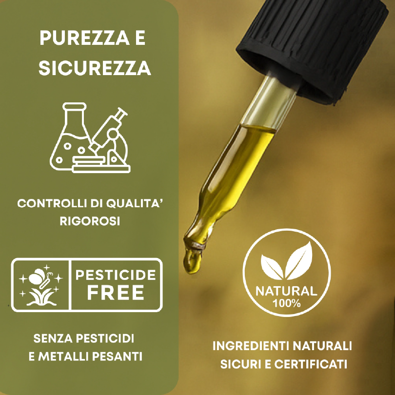 Questo assicura che il nostro olio contenga una vasta gamma di componenti naturalmente presenti nella pianta di canapa, come terpeni, flavonoidi e altri cannabinoidi minori. Otteniamo così un olio CBD dorato di altissima qualità realizzato con materie prime provenienti da agricoltura biologica è un prodotto privo di sostanze o additivi chimici, come erbicidi o pesticidi, aflatossine e metalli pesanti.